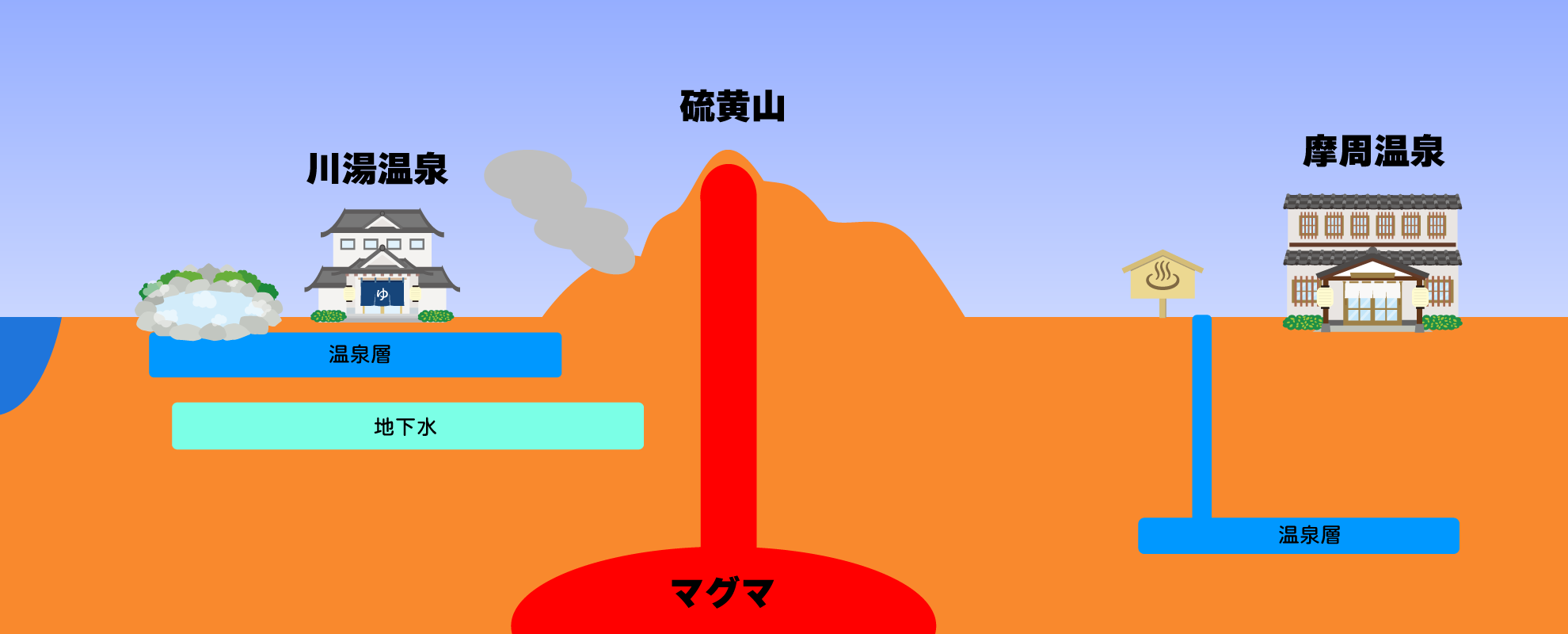 この温泉は硫黄山(アトサヌプリ)の火山活動による熱で地中で熱せられ地下水が水蒸気となって上昇し、噴気孔の近くで蒸気と分離します。弟子屈町の下を流下する層状泉となって湯の川沿いに湧出しています。川湯温泉のように、浅い層でこのような現象がみられその下の層では普通の地下水になっている例は、世界でも珍しい温泉です。